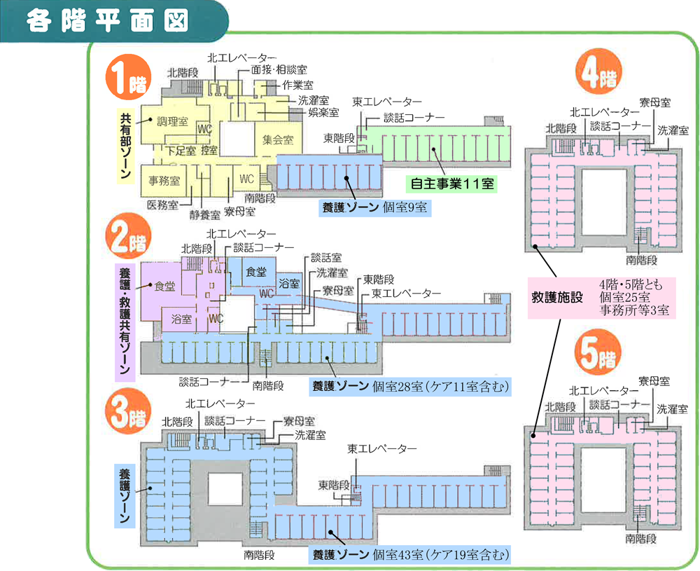 居室(個室・洗面所付き)、浴室、トイレ、食堂、医務室、洗濯室、共有の談話スペースがあります。